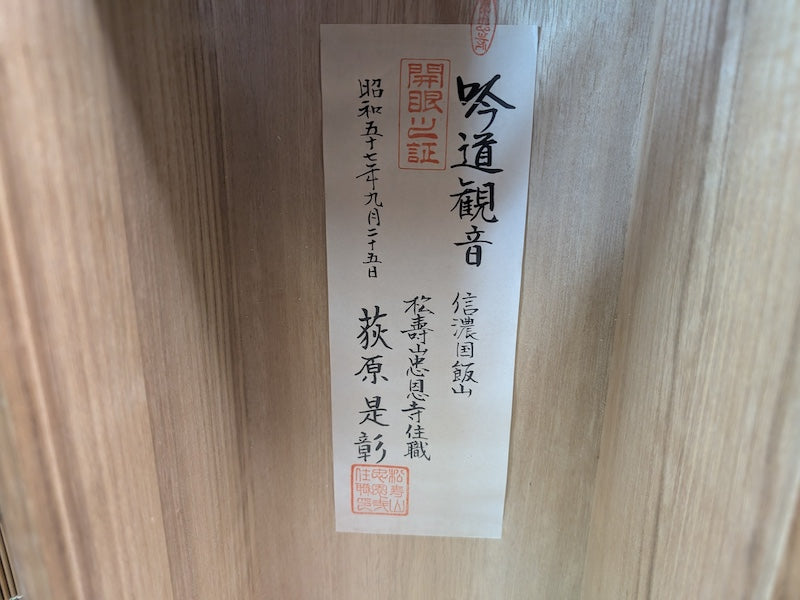 The included certificate confirms the official consecration (開眼ツ証) of the statue on September 25, 1930 (Showa 5). It was issued and signed by OGIWARA Koreaki (荻原是彰), the chief priest of Shōju Chūon-ji Temple (松壽忠恩寺) in Iiyama, Shinano Province (信濃国飯山). Please see photo number 2