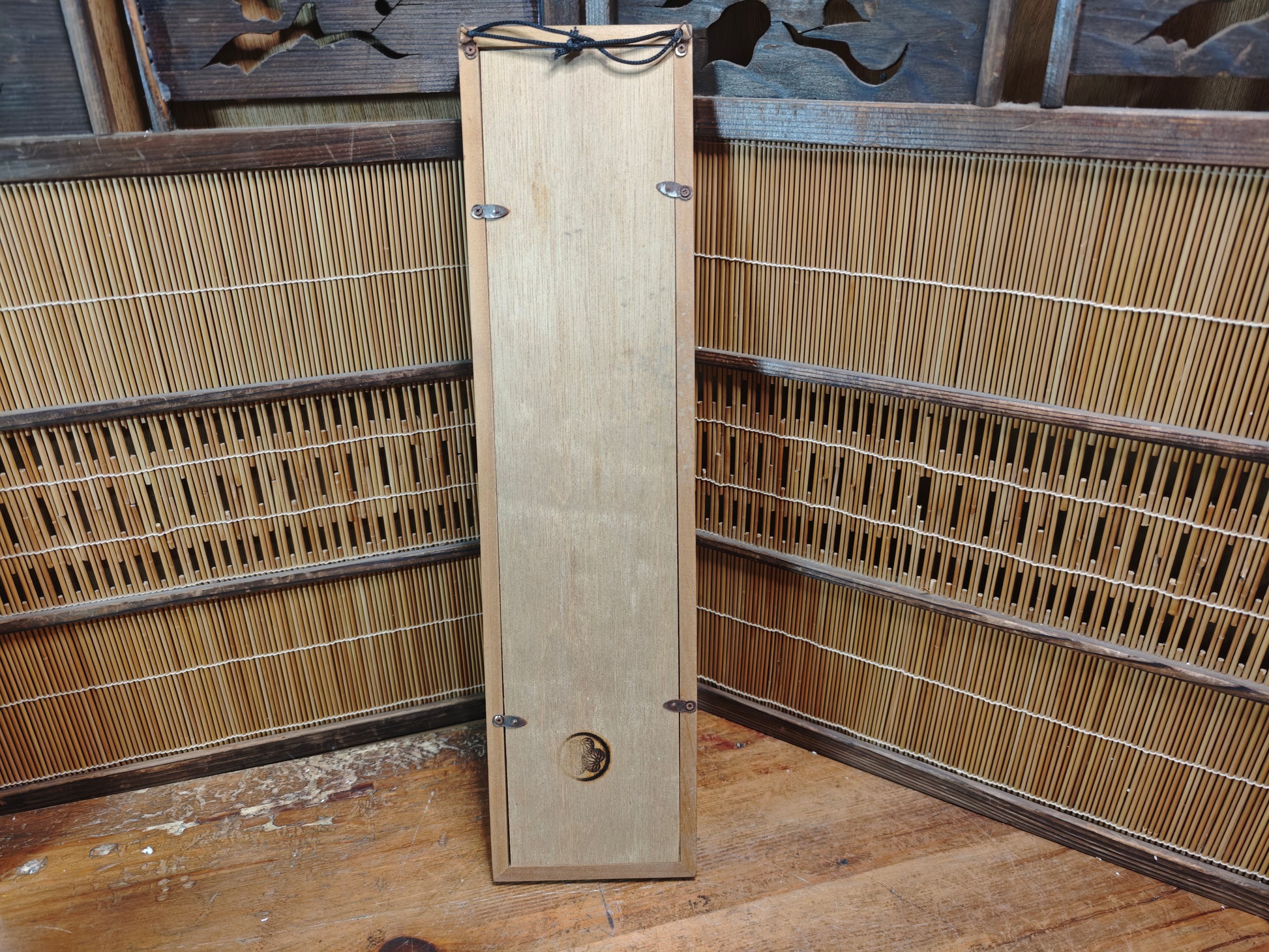 The artwork is presented in a vertical format reminiscent of a traditional hanging scroll (kakejiku style) and housed in a vintage wooden frame from the 1960s–1970s, adding depth, warmth, and authenticity to the overall presentation.
