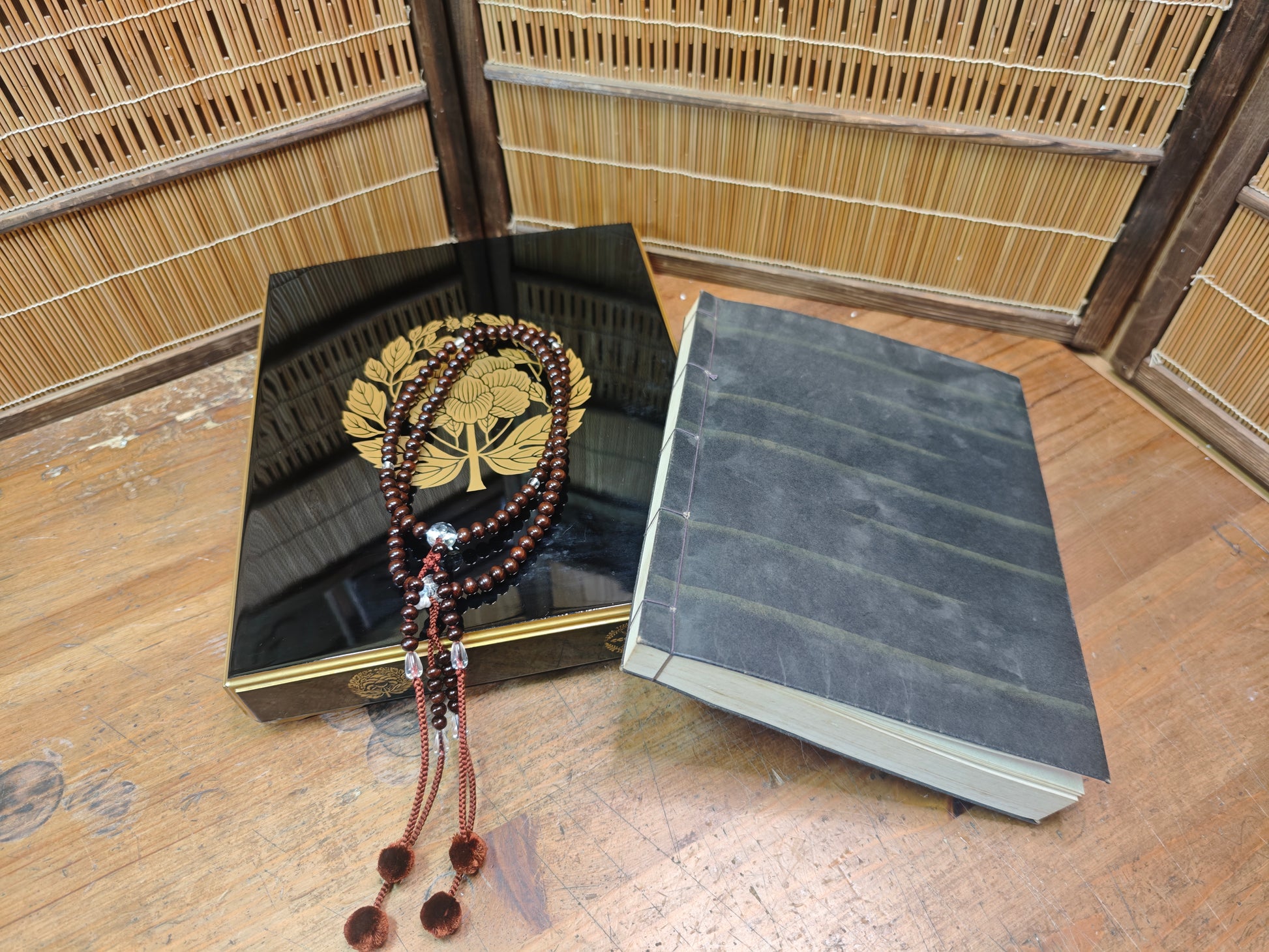 The set includes a large Buddhist prayer book, a beautifully crafted juzu (prayer beads), and a traditional wooden storage box. The prayer book features elegant Japanese calligraphy, while the juzu beads—made from an unknown natural material (not plastic)—offer a rich, authentic feel.