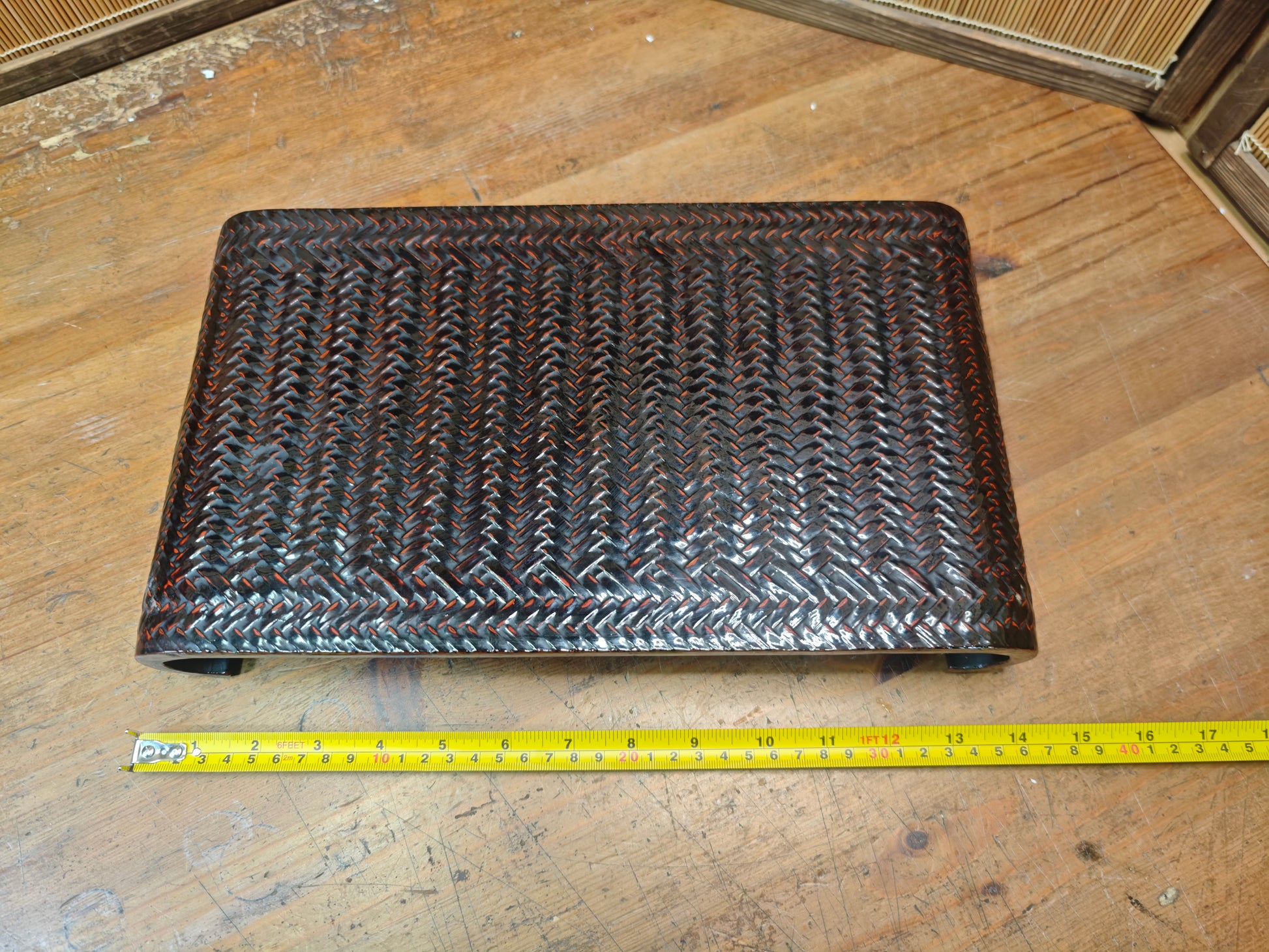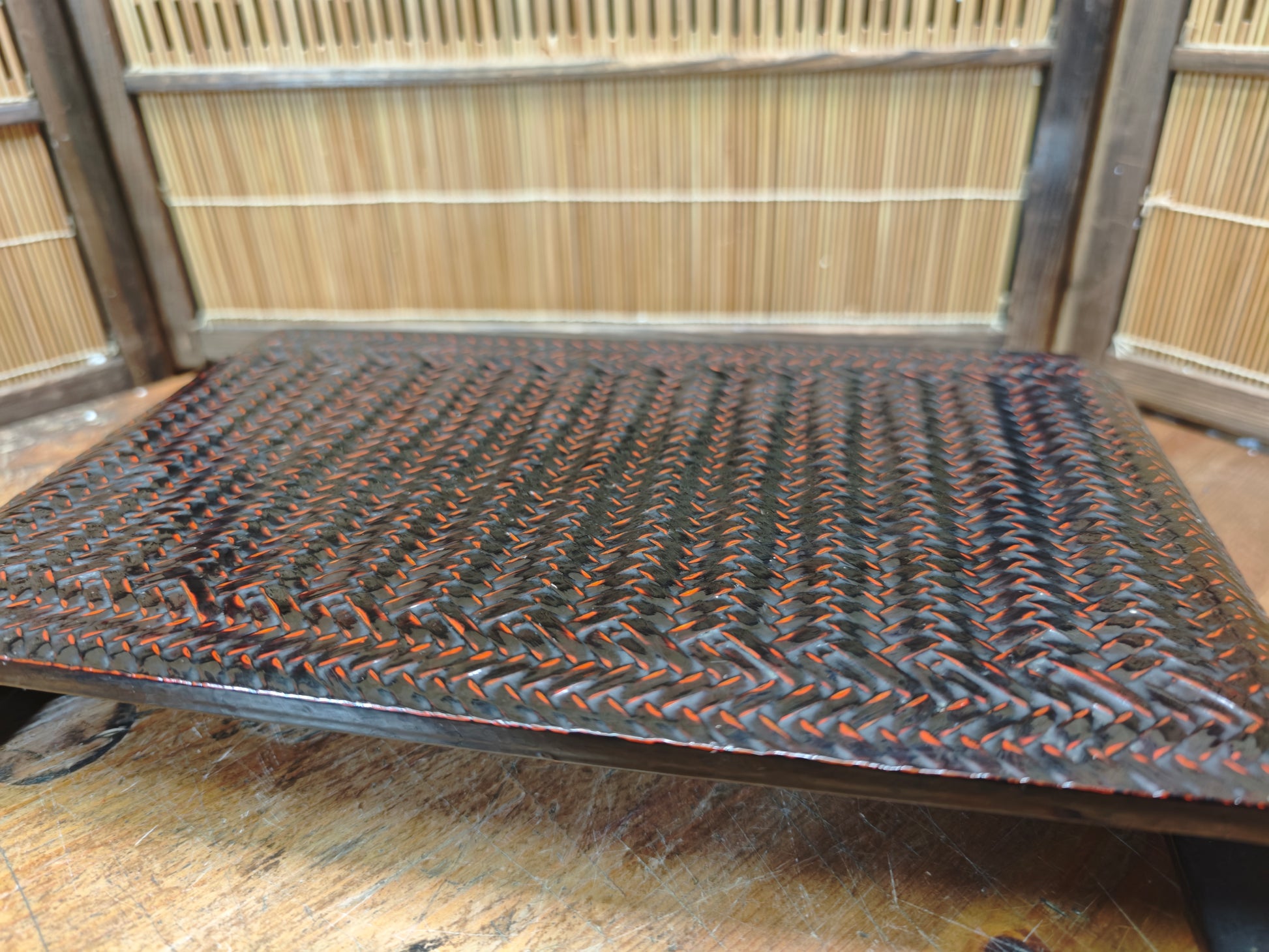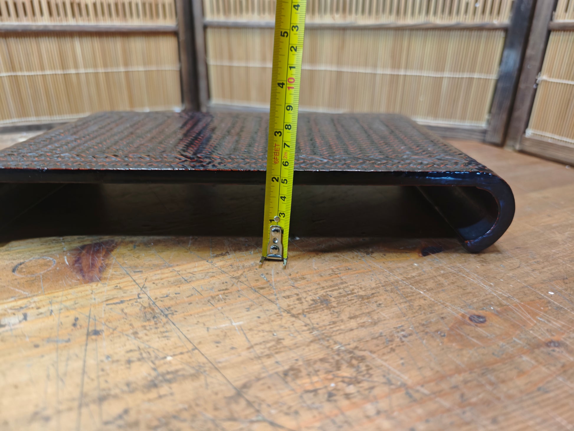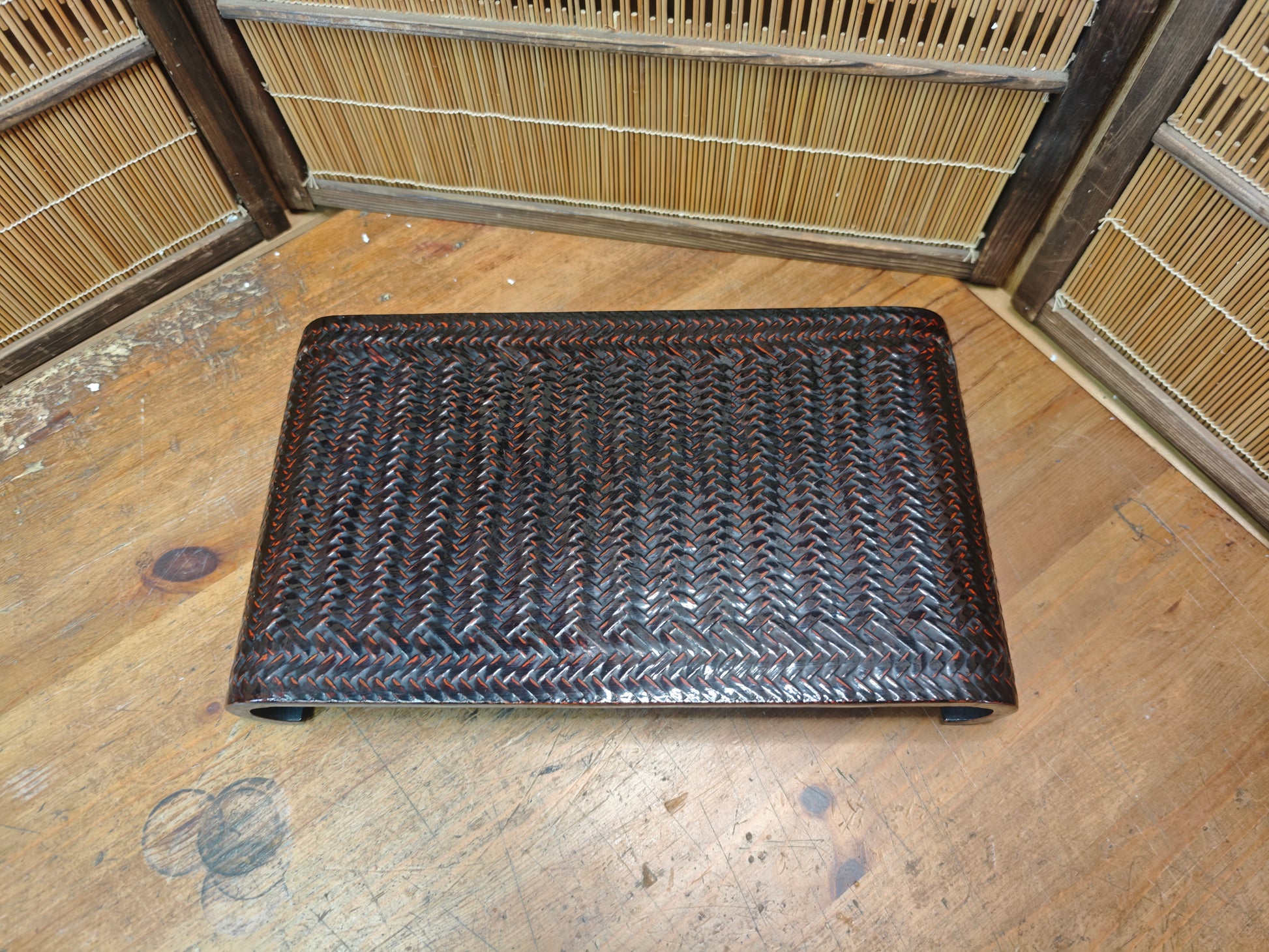 This authentic piece features a beautifully woven-style surface pattern with deep red and black lacquer tones, giving it a unique visual depth and elegant presence. Its curved leg design adds a refined, flowing silhouette that reflects traditional Japanese craftsmanship.